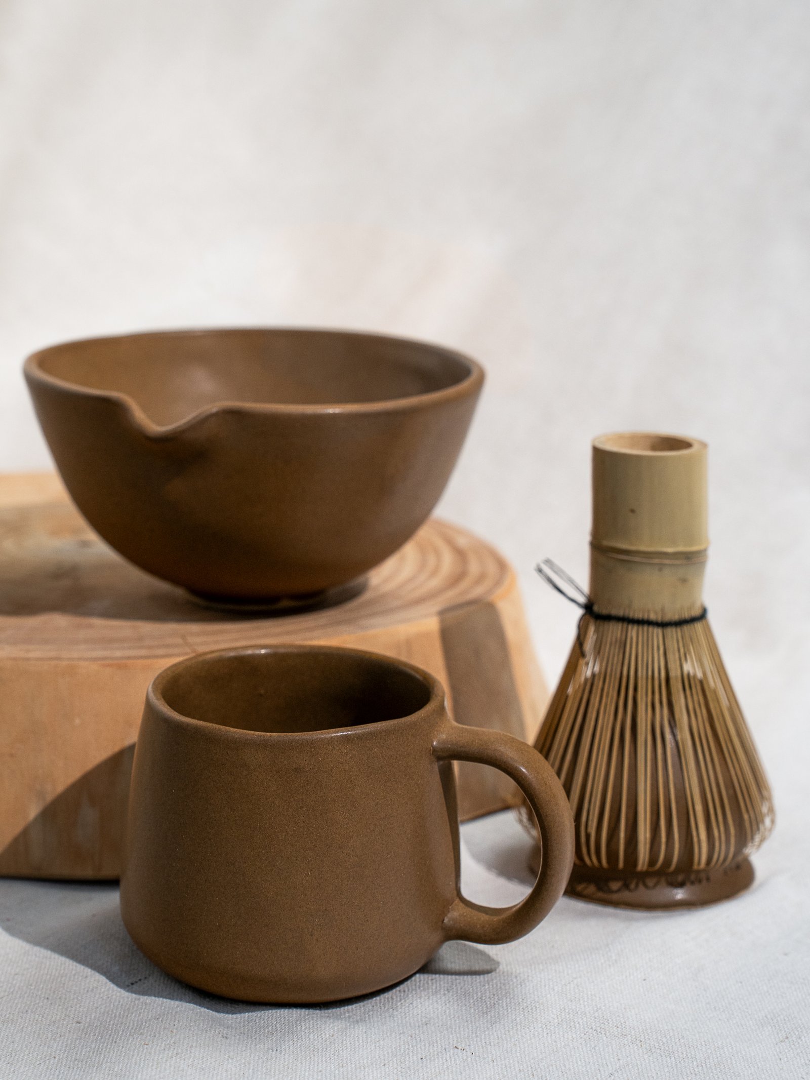 O kit matchá contém 1 bowl de 500ml, 1 caneca de 250ml e um porta Chasen.